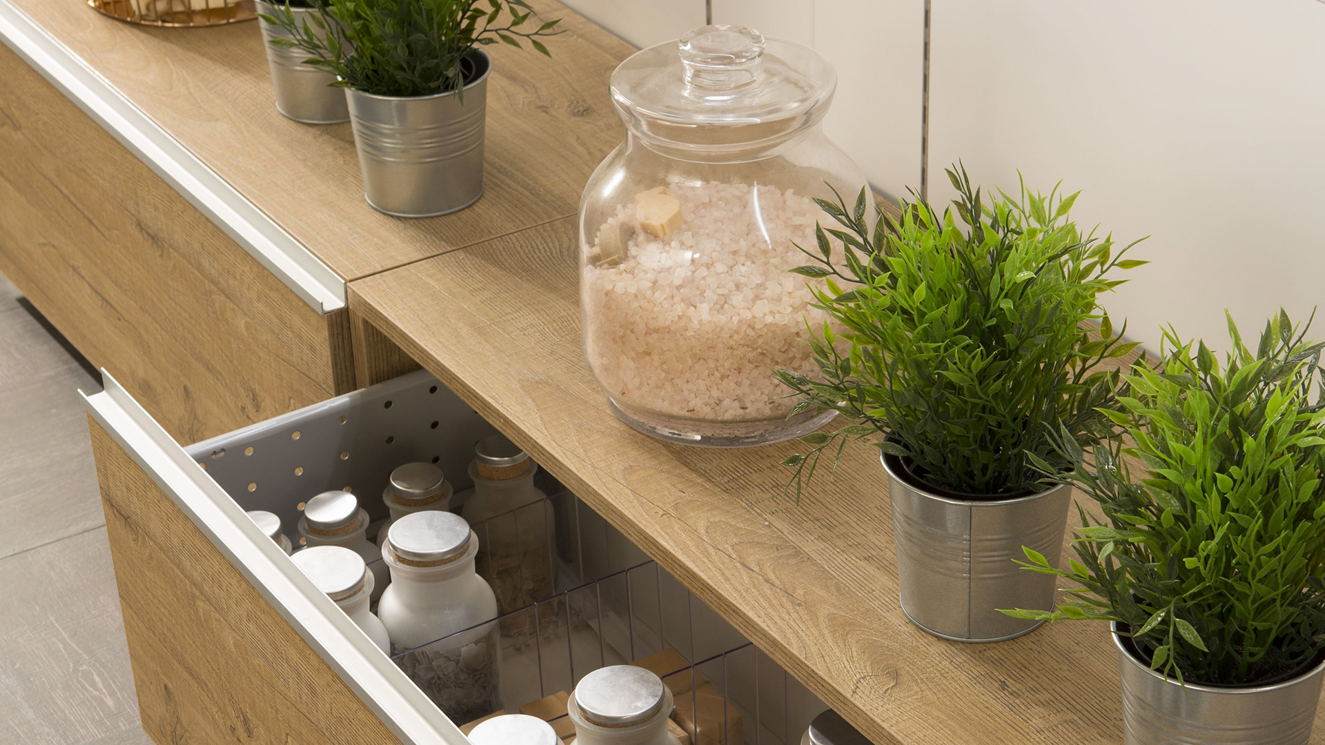 Possibilité d'ajouter des meubles à tiroirs au bas des panneaux afin d'y entreposer le stock de produits.